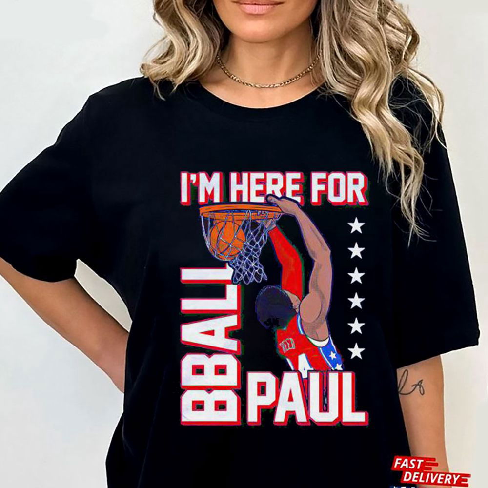 Featuring a sleek design, the t-shirt proudly displays the iconic slogan “I’m Here For Bball Paul Reed” in bold, vibrant colors that are sure to catch everyone’s attention. It’s the ultimate conversation starter and a must-have for any die-hard fan.