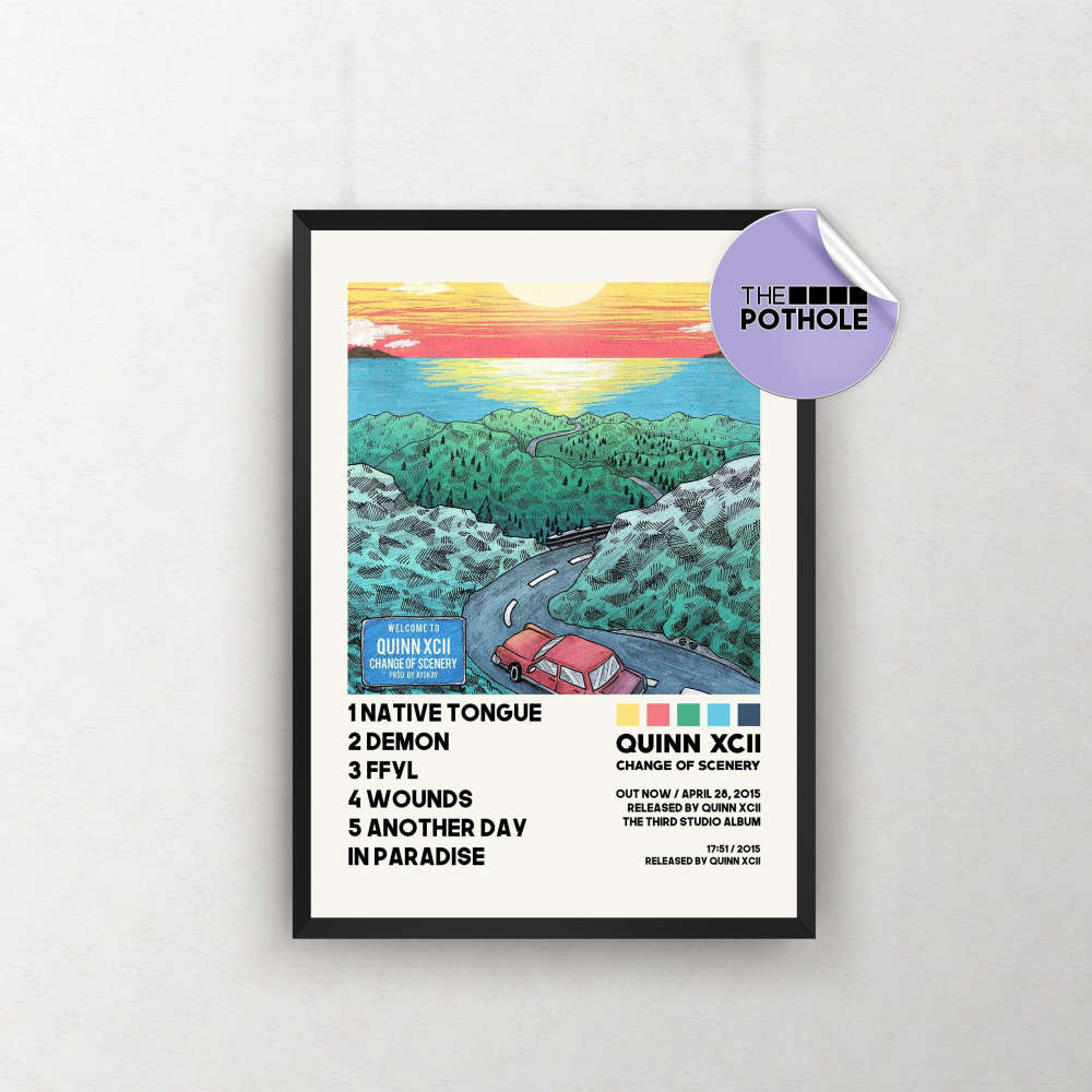 Each poster showcases the iconic album cover of Quinn XCII’s Change of Scenery, capturing the essence of his music and artistic vision. With meticulous attention to detail and vibrant colors, these posters bring the magic of Quinn XCII’s world directly to your walls.